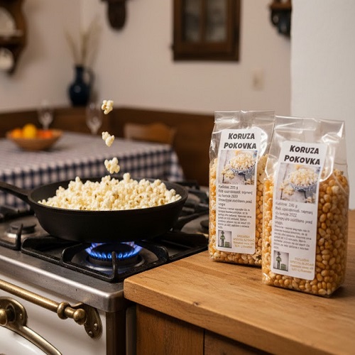 Priprava domače pokovke je preprosta in hitra. Ker gre za ekološko pridelano koruzo pokovko, boste dobili bolj zdrav in hrustljav prigrizek kot pri kupljenih različicah za mikrovalovno pečico.